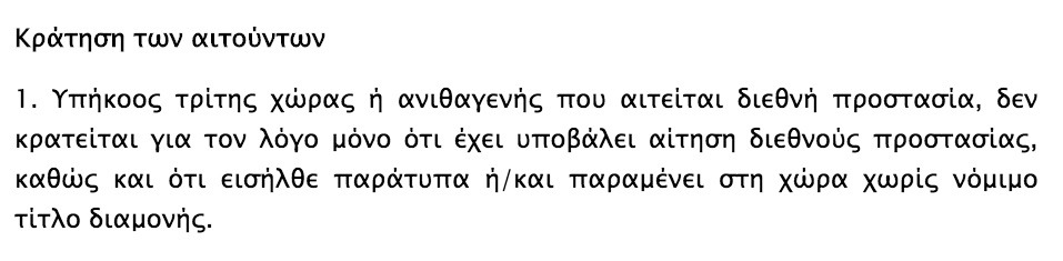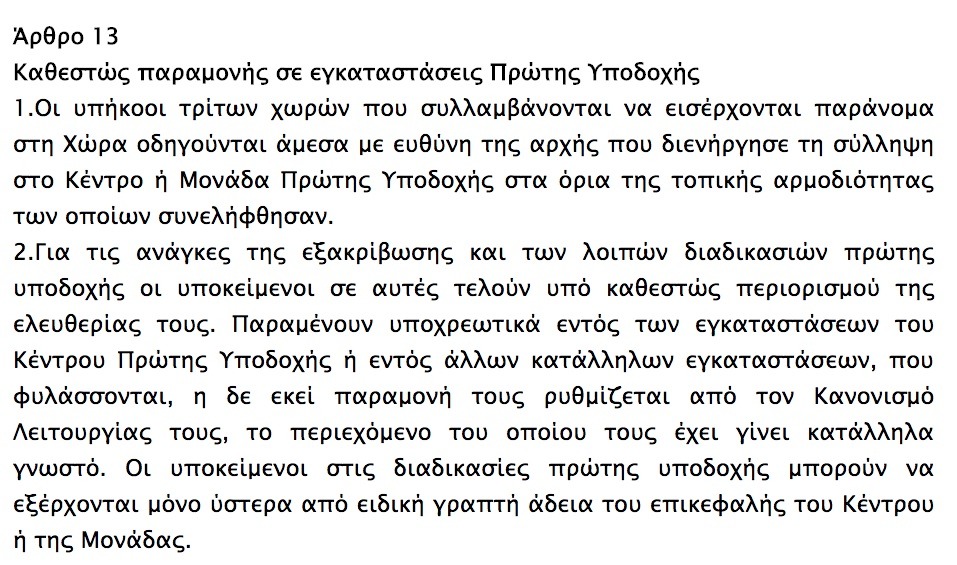 Ο προηγούμενος νόμος (3907/2011) μιλούσε ξεκάθαρα για σύλληψη όσων έμπαιναν στη χώρα παράνομα. Γενικός κανόνας η σύλληψη, εξαίρεση η ελευθερία. Ο νέος νόμος τα αντέστρεψε: γενικός κανόνας η ελευθερία, εξαίρεση η σύλληψη.