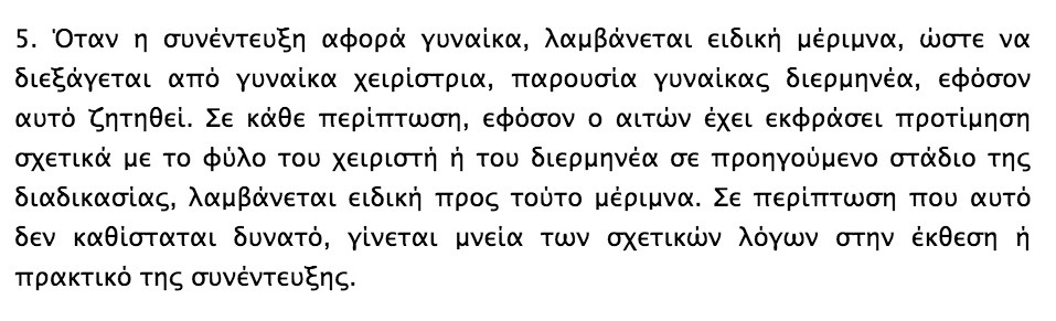 μια γυναίκα να λέει “εγώ δεν μιλάω σε άντρες”. Ο νέος νόμος για την παροχή ασύλου απαντάει: το σεβόμαστε, θα ψάξουμε να σας βρούμε γυναίκα υπάλληλο και γυναίκα διερμηνέα! Να τι προβλέπει το άρθρο 77, παράγραφος 5: